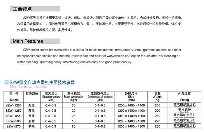 SZW系列夾燙機適用于賓館、飯店、部隊、洗染店、服裝廠等企事業(yè)單位,對羊毛、合成纖維及棉、毛織物的褲縫、衣領等的定型燙加工,同時也可燙平小面積臺布、餐巾、手帕等物品,主要用于干洗、水洗后織物的熨燙處理。該機操作簡單,維護保養(yǎng)都很方便,實用性強。